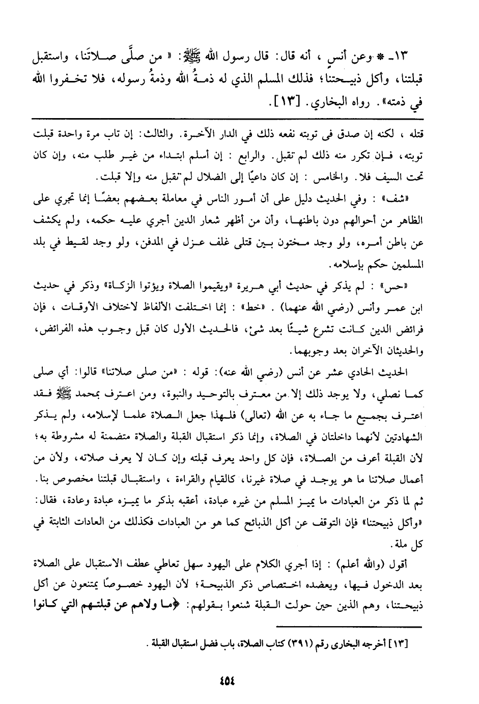 13 - وعن أنس، أنه قال رسول الله: (من صلَّى صلاتنا، واستقبل