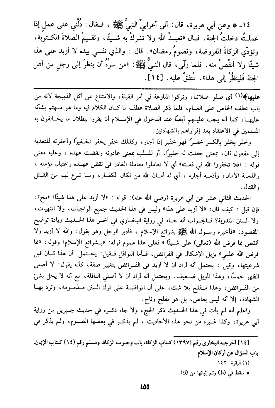 14 - وعن أبي هريرة، قال أتى أعرابي النبي - صلى الله عليه وسلم -، فقال: دُلني على عملِ إذا