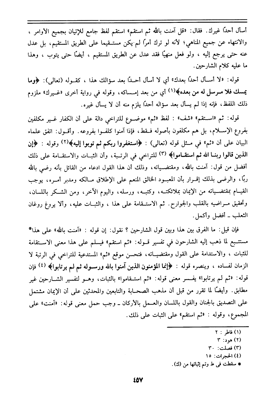 قوله: ثم (استقم) (شف): لفظ (ثم) موضوع للتراخي دالة على أن الكفار غير مكلفين