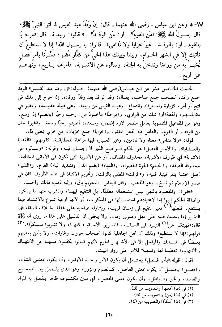 17 - وعن ابن العباس _ رضي الله عنهما_ قال: إن وفد عبد القيس لما أتوا النبي - صلى الله عليه وسلم -؛