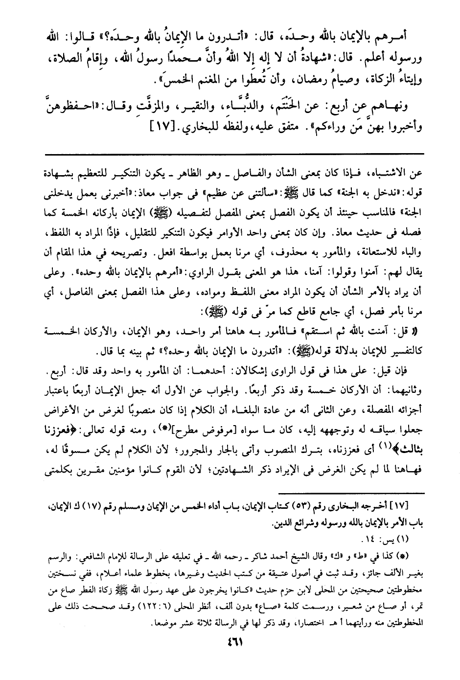 كالتفسير للإيمان بدلالة قوله (- صلى الله عليه وسلم -): (أتدرون ما الإيمان بالله وحده؟) ثم بينه بما قال.