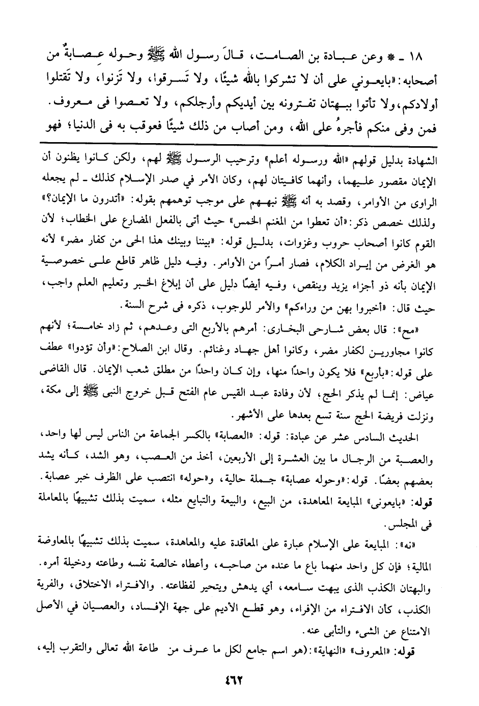 الحديث السادس عشر عن عبادة: قوله: (العصابة) بالكسر الجماعة من الناس ليس لها واحد،