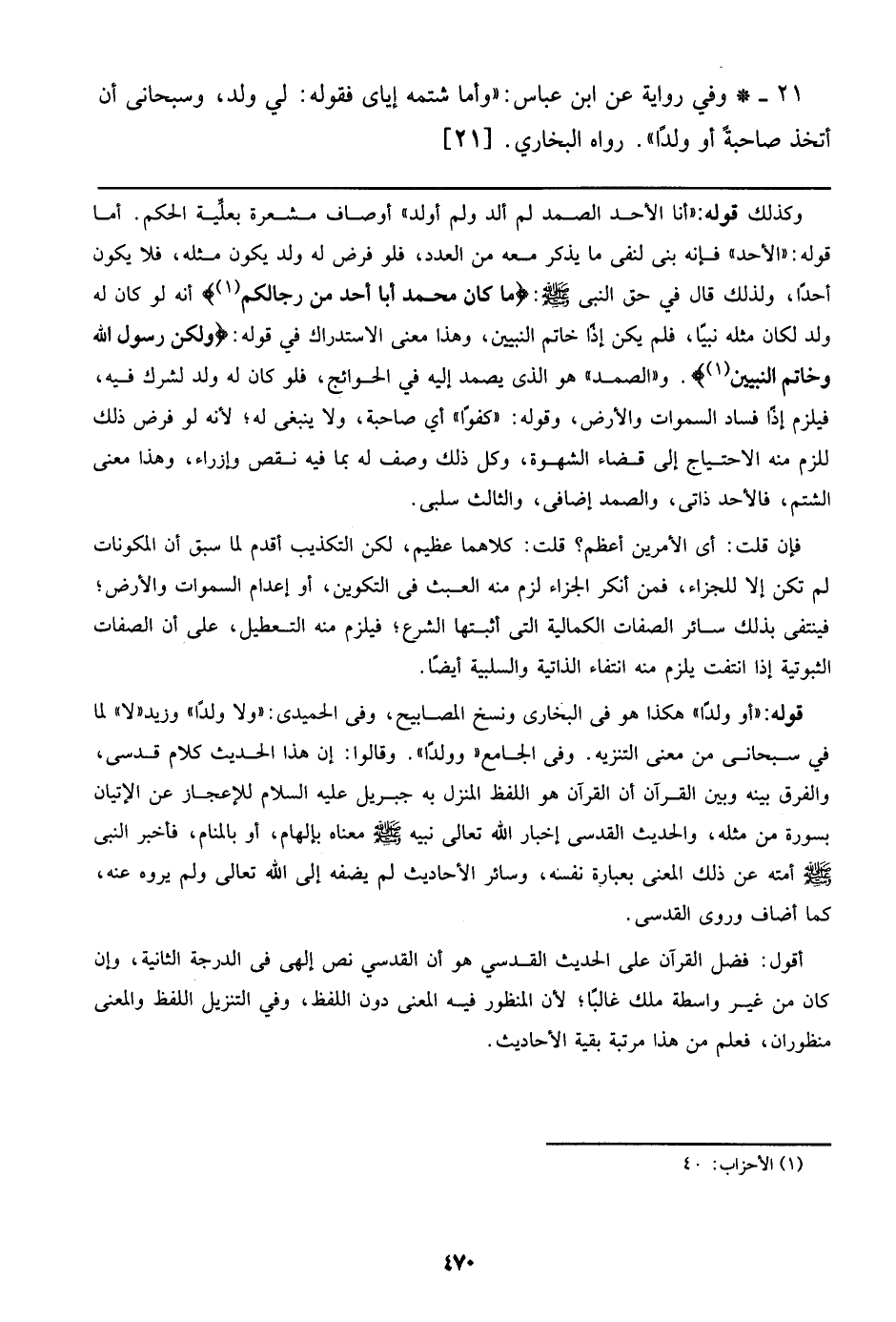 21_ وفي رواية عن ابن عباس: (وأما شتمه إياي فقوله: لي ولد، وسبحاني أن