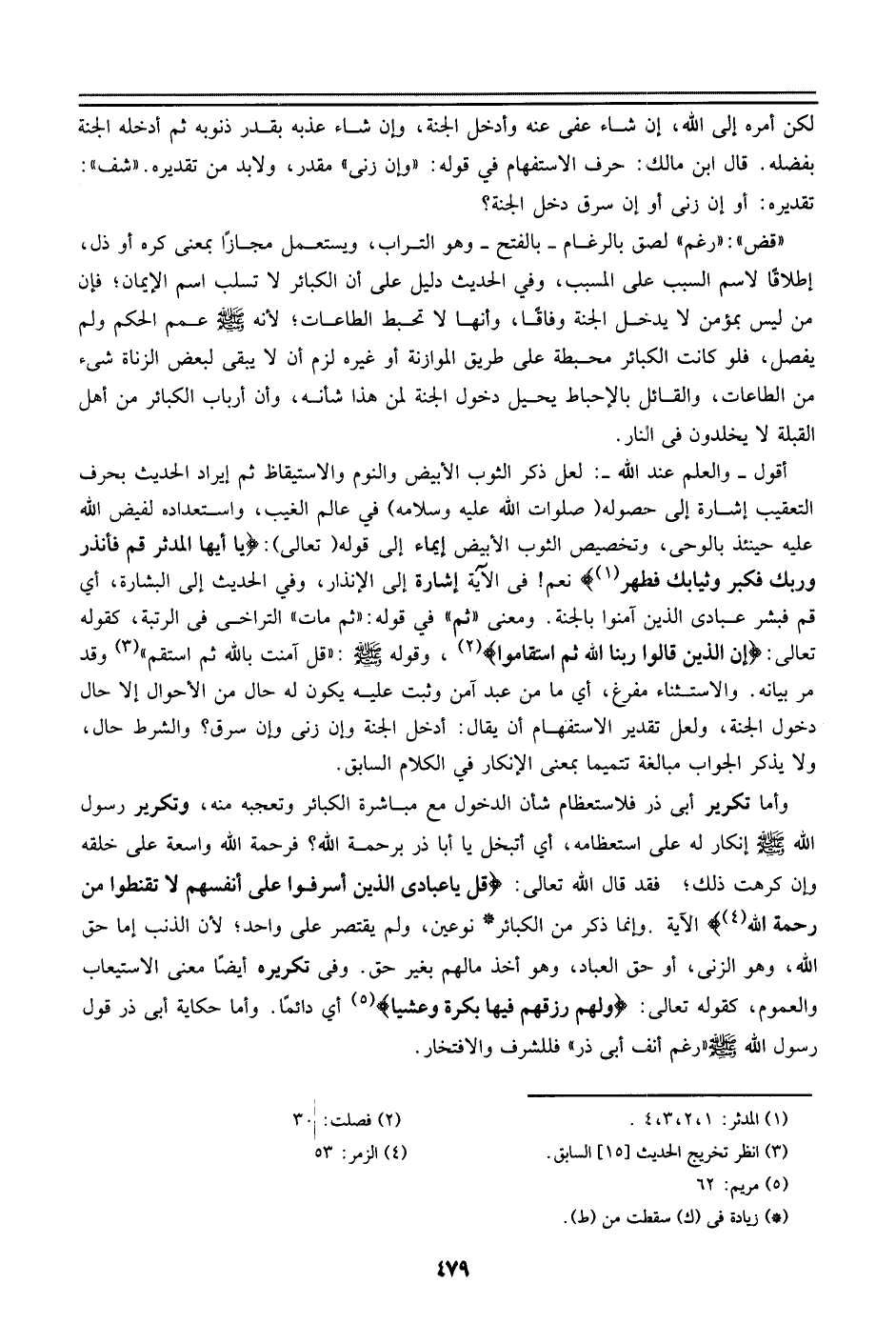 وأما تكرير أبي ذر فلاستعظام شأن الدخول مع مباشرة الكبائر وتعجبه منه، وتكرير رسول