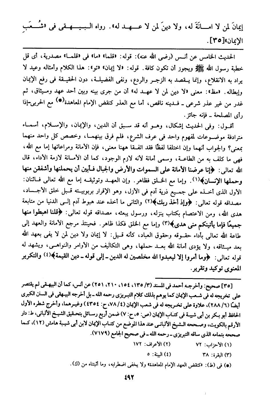 إيمان لمن لا أمانة له، ولا دين لمن لا عهد له). رواه البيهقي و (شعب