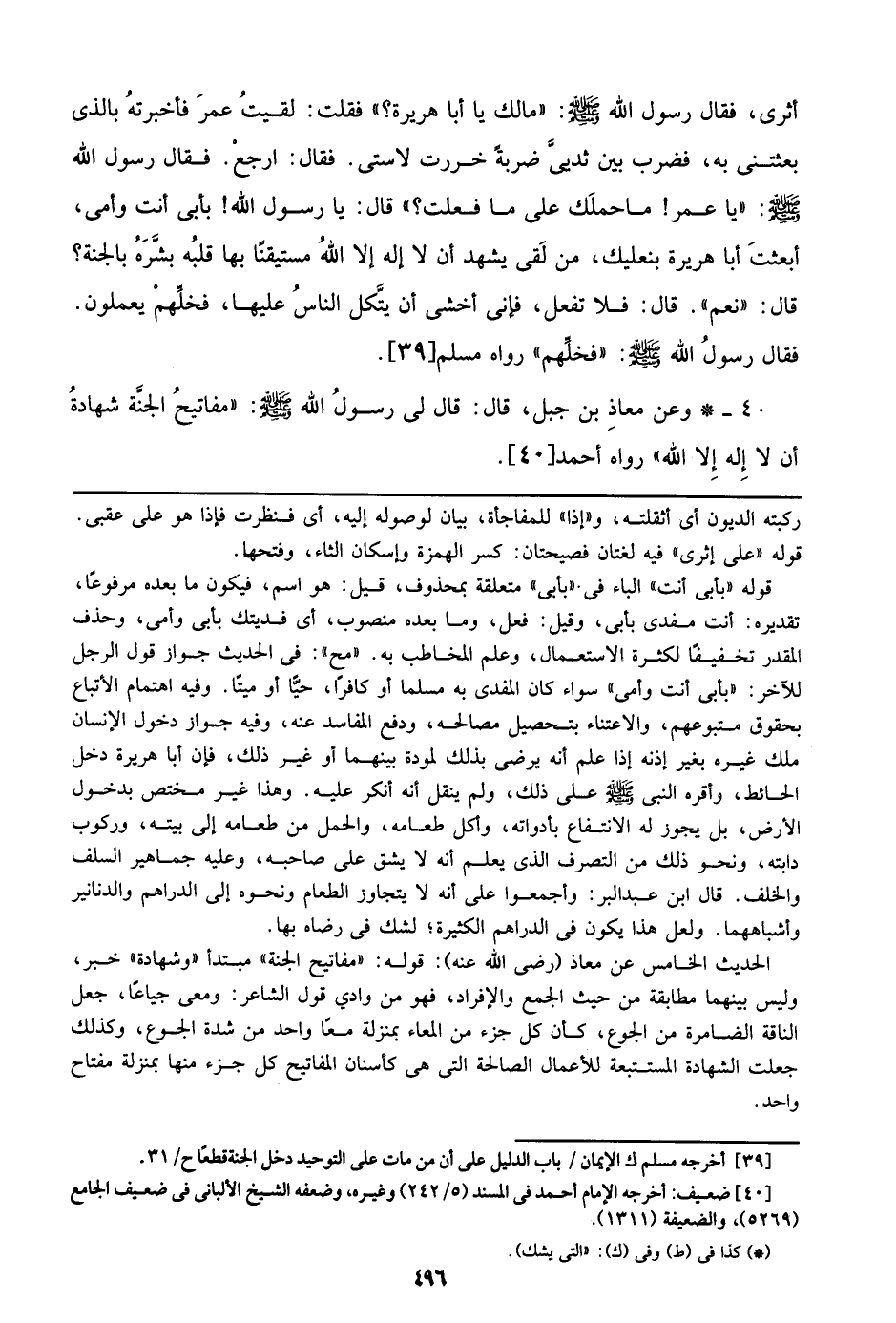 أثرى، فقال رسول الله - صلى الله عليه وسلم -: (مالك يا أبا هريرة؟) فقلت: لقيت عمر فأخبرته بالذي بعثتني به، فضرب بين ثديي ضربة خررت لاستي. فقال: ارجع. فقال رسول الله - صلى الله عليه وسلم -: (ياعمر! ماحملك على مافعلت؟) قال: يارسول الله! بأبي أنت وأمي، أبعثت أبا هريرة بنعليك، من لقى يسهد أن لا إله إلا الله مستيقنا بها قلبه بشره بالجنة؟ قال: (نعم). قال: فلا تفعل، فآني أخشى أن يتكل الناس عليها، فخلهم يعملون. فقال رسول الله - صلى الله عليه وسلم -: (فخلهم) رواه مسلم.