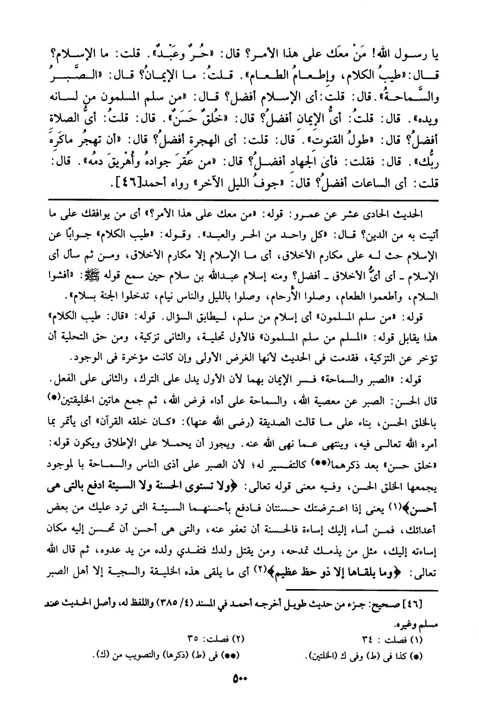 قال الحسن: الصبر عن معصية الله، والسماحة على أداء فرض الله، ثم جمع هاتين الهليقتين باللق الحسن، بناء ما قالت الصديقة (رضي الله عنها): (كان خلقه القرآن) أي يأتمر بما أمره الله تعالى فيه، وينتهي عما نهى الله عنه، ويجوز أن يحملا على الإطلاق ويكون قوله: (خلق حسن) بعد ذكرهما كالتفسير له؛ لأن الصبر على أذى الناس والسماحة بالموجود يجمعهما الخلق الحسن، وفيه معنى قوله تعالى: (ولا تستوي الحنة ولا السيئة غدفع بالتي هي أحسن) يعني إذا اعترضتك حسنتان فادفع بأحسنهما السيئة التي ترد عليك من بعض أعدائك، فمن أساء إليك إساءة فالحسنة أن تعفو عنه، والتي هي أحسن أن تحسن إليه مكان إساءته إليك، مثل من يذمك تمدحه، ومن يقتل ولده فتفتدي ولده من يد عدوه، ثم قال الله تعالى: (وما يلقاها إلا ذو حظ عظيم) أي ما يلقى هذه الخليقة والسجية إلا أهل الصبر