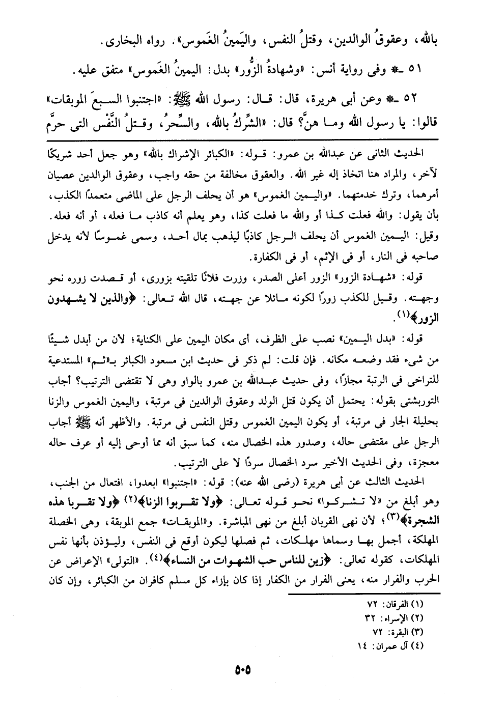 51 - وفي رواية أنس: ((وشهادة الزور)) بدل: اليمن الغموس)) متفق عليه.