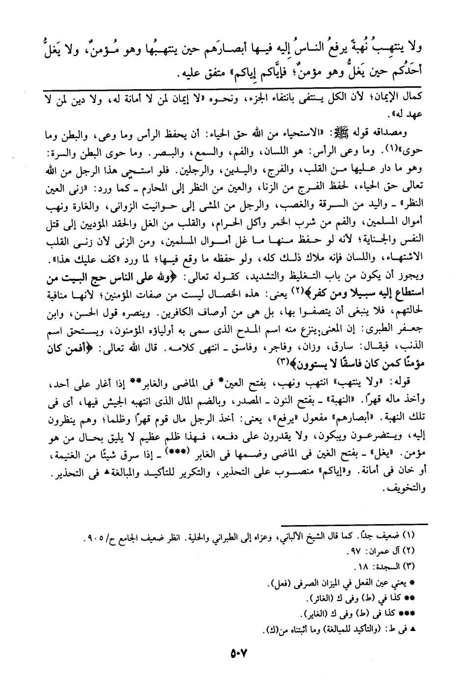 ومصداقه قوله صلى الله عليه وسلم: ((الاستحياء من الله حق الحياء: أن يحفظ الرأس وما وعى، والبطن وما حوى)). وما وعى الرأس: هو اللسان، والفم، والسمع، والبصر. وما حوى البطن والسرة: وهو ما دار عليها من القلب، والفرج، واليدين، والرجلين. فلو استحى هذا الرجل من الله تعالى حق الحياء، لحفظ الفرج من الزنا، والعين من النظر إلى المحارم – كما ورد: ((وزنى العين النظر)) – واليد من السرقة والغصب، والرجل من المشي إلى حوانيت الزواني، والغارة ونهب أموال المسلمين، والفم من شرب الخمر وأكل الحرام، والقلب من الغل والحقد المؤديين إلى قتل النفس والجناية؛ لأنه لو حفظ منها ما غل أموال المسلمين، ومن الزنى لأن زنى القلب الاشتهاء، واللسان فإنه ملاك ذلك كله، ولو حفظه ما وقع فيها؛ لما ورد ((كف عليك هذا)). ويجوز أن يكون من باب التغليظ والتشديد، كقوله تعالى: {ولِلَّهِ عَلَى النَّاسِ حِجُّ البَيْتِ مَنِ اسْتَطَاعَ إلَيْهِ سَبِيلاً ومَن كَفَرَ} يعني: هذه الخصال ليست من صفات المؤمنين؛ لأنها منافية لحالتهم، فلا ينبغي أن يتصفوا بها، بل هي من أوصاف الكافرين. وينصره قول الحسن، وابن جعفر الطبري: إن المعنى: ينزع منه اسم المدح الذي سمى به أولياؤه المؤمنون، ويستحق اسم الذنب، فيقال: سارق، وزان، وفاجر، وفاسق – انتهى كلامه. قال الله تعالى: {أَفَمَن كَانَ مُؤْمِنًا كَمَن كَانَ فَاسِقًا لاَّ يَسْتَوُونَ}.