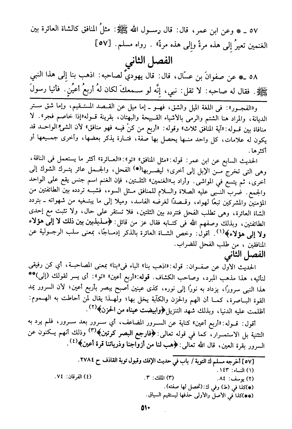 الحديث السابع عن ابن عمر: قوله: ((مثل المنافق)) ((تو)): ((العائرة)) أكير ما يستعمل في الناقة، وهي التي تخرج من الإبل إلى أخرى؛ ليضربها الفحل، والجمل عائر يترك الشوك إلى أخرى، ثم يتسع في المواشي. وأراد بـ ((الغنمين)) الثلثين، فإن الغنم اسم جنس يقع على الواحد والجمع. ضرب النبي عليه الصلاة والسلام للمنافق مثل السوء، فشبه تردده بين الطائفتين من المؤمنين والمشركين تبعا لهواه، وقصدا لغرضه الفاسد، وميلا إلى ما يبتغيه من شهواته – بتردد الشاة العائرة، وهي تطلب الفحل فتتردد بين الثلتين، فلا تستقر على حال، ولا تثبت مع إحدى الطائفتين، وبذلك وصفهم الله في كتابه فقال عز من قائل: {مُذَبْذَبِينَ بَيْنَ ذَلِكَ لا إلَى هَؤُلاءِ ولا إلَى هَؤُلاءِ}. أقول: وخص الشاة العائرة بالذكر إدماجا، بمعنى سلب الرجولية عن النافقين، من طلب الفحل للضراب.