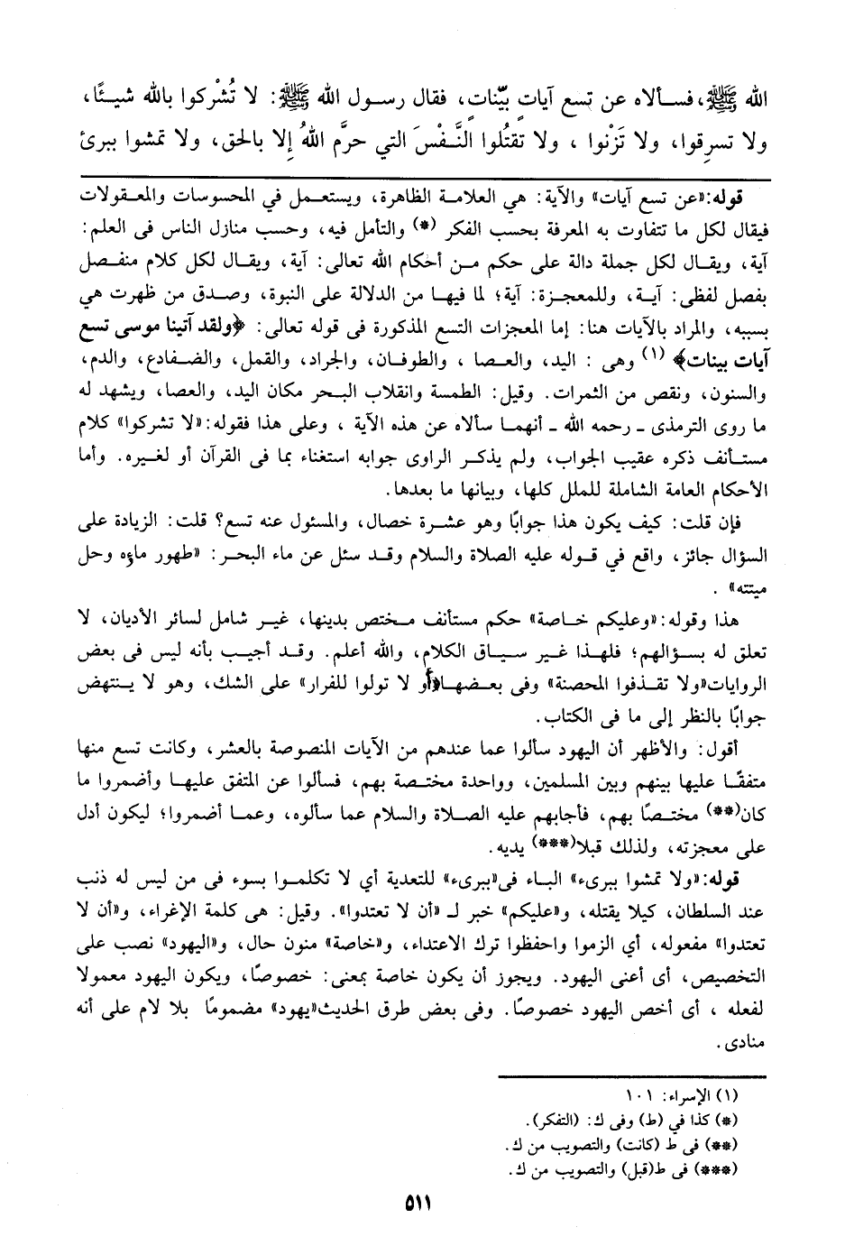 قوله: ((عن تسع آيات)) والآية: هي العلامة الظاهرة، ويستعمل في الحسوسات والمعقولات فيقال لكل ما تتفاوت به المعرفة بحسب الفكر والتأمل فيه، وحسب منازل الناس في العلم: آية، ويقال لكل جملة دالة على حكم من أحكام الله تعالى: آية، ويقال لكل كلام منفصل بفصل لفظي: آية، وللمعجزة: آية؛ لما فيها من الدلالة على النبوة، وصدق من ظهرت هي بسببه، والمراد بالآيات هنا: إما المعجزات التسع المذكورة في قوله تعالى: {ولَقَدْ آتَيْنَا مُوسَى تِسْعَ آيَاتٍ بَيِّنَاتٍ} وهي: اليد، والعصا، والطوفان، والجراد، والقمل، والضفادع، والدم، والسنون، ونقص من الثمرات. وقيل الطمسة وانقلاب البحر مكان اليد، والعصا، ويشهد له ما روى الترمذي – رحمه الله – أنهما سألاه عن هذه الآية، وعلى هذا فقوله: ((لا تشركوا)) كلام مستأنف ذكره عقيب الجواب، ولم يذكر الراوي جوابه استغناء بما في القرآن أو لغيره. وأما الأحكام العامة الشاملة للملل كلها، وبيانها ما بعدها.
