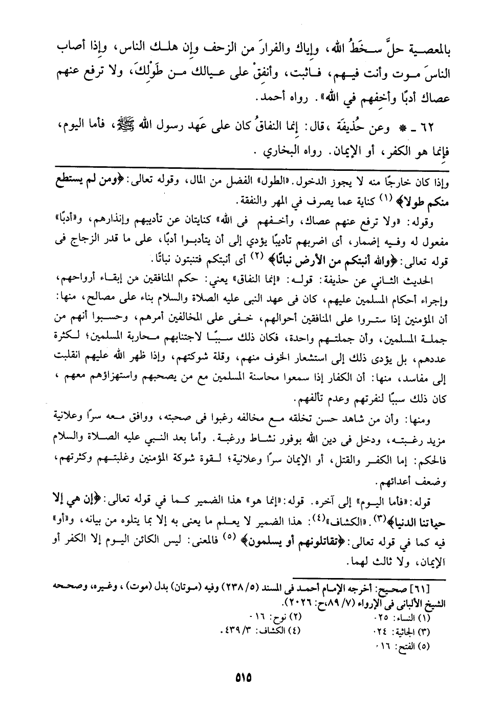 62 - وعن حذيفة، قال: إنما النفاق كان على عهد رسول الله صلى الله عليه وسلم، فأما اليوم، فإنما هو الكفر، أو الإيمان. رواه البخاري.