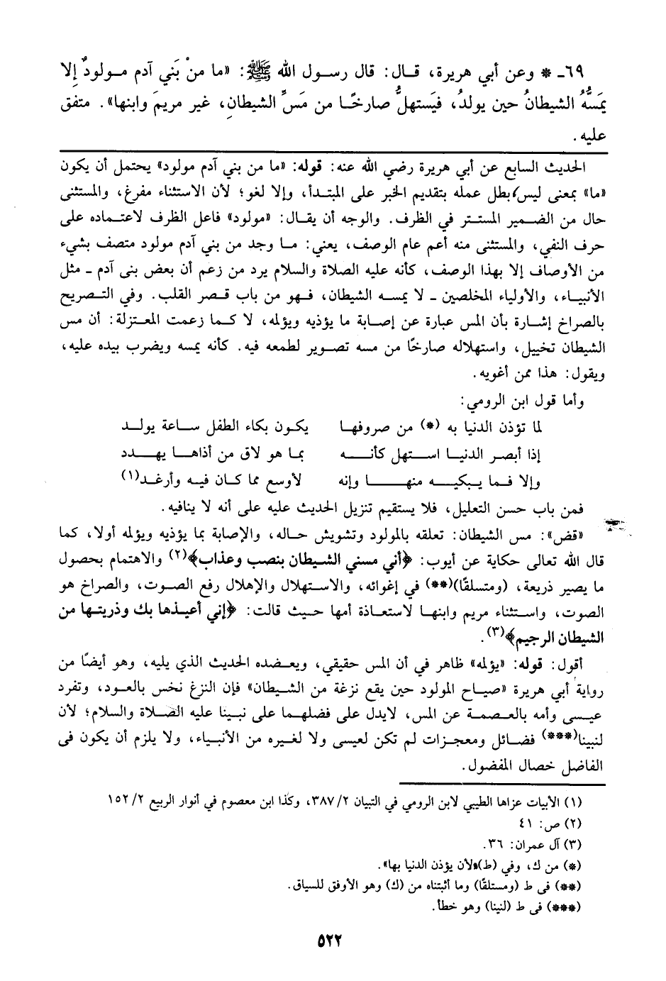 ((قض)): مس الشيطان: تعلقه بالمولود وتشويش حاله، والإصابة بما يؤذيه ويؤلمه أولا، كما قال الله تعالى حكاية عن أيوب: {أَنِّي مَسَّنِيَ الشَّيْطَانُ بِنُصْبٍ وعَذَابٍ} والاهتمام بحصول ما يصير ذريعة، (ومتسلقا) في إغوائه، والاستهلال والإهلال رفع الصوت، والصراخ هو الصوت، واستثناء مريم وابنها لاستعاذة أمها حيث قالت: {إنِّي أُعِيذُهَا بِكَ وذُرِّيَّتَهَا مِنَ الشَّيْطَانِ الرَّجِيمِ}.