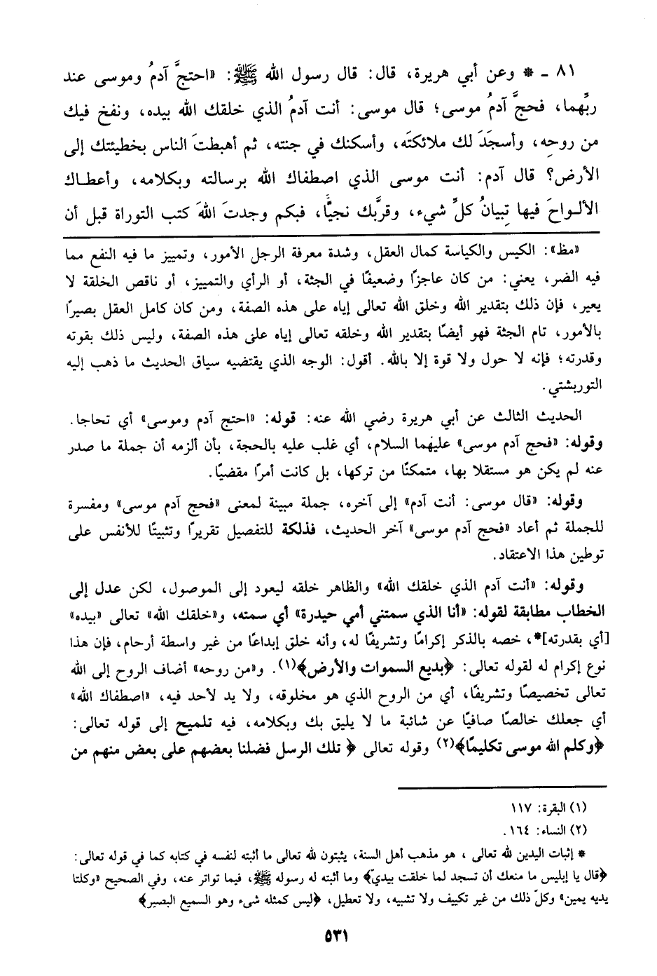 81 - وعن أبي هريرة، قال: قال رسول الله صلى الله عليه وسلم: ((احتج آدم وموسى عند ربهما، فحج آدم موسى؛ قال موسى: أنت آدم الذي خلقك الله بيده، ونفخ فيك من روحه، وأسجد لك ملائكته، وأسكنك في جنته، ثم أهبطت الناس بخطيئتك إلى الأرض؟ قال آدم: أنت موسى الذي اصطفاك الله برسالته وبكلامه، وأعطاك الألواح فيها تبيان كل شيء، وقربك نجيا، فبكم وجدت الله كتب التوراة قبل أن