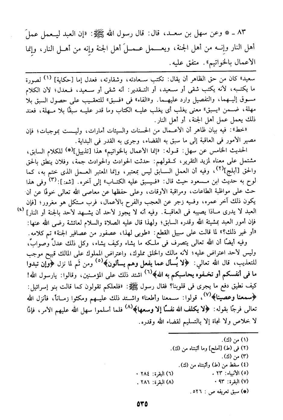 83 - وعن سهل بن سعد، قال: قال رسول الله صلى الله عليه وسلم: ((إن العبد ليعمل عمل أهل النار وإنه من أهل الجنة، ويعمل عمل أهل الجنة وإنه من أهل النار، وإنما الأعمال بالخواتيم)). متفق عليه.