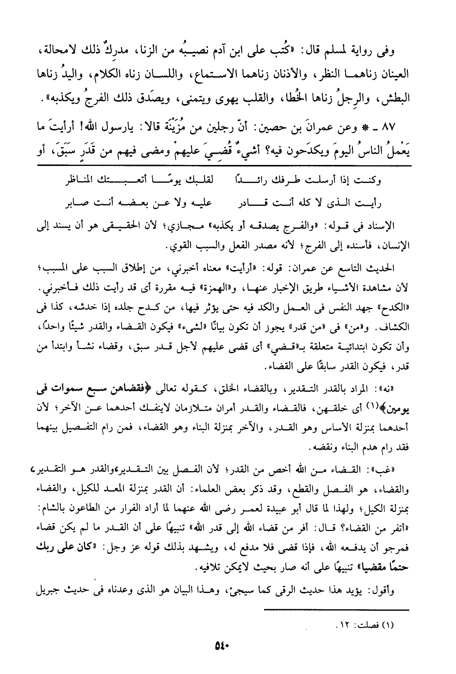 87 - وعن عمران بن حصين: أن رجلين من مزينة قالا: يا رسول الله! أرأيت ما يعمل الناس اليوم ويكدحون فيه؟ أشيء قضي عليهم ومضى فيهم من قدر سبق، أو