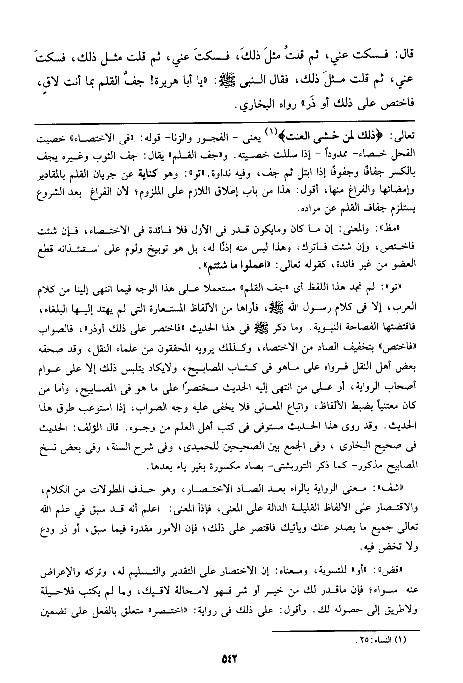 ((تو)): لم نجد هذا اللفظ أي ((جف القلم)) مستعملا على هذا الوجه فيما انتهى إلينا من كلام العرب، إلا في كلام رسول الله صلى الله عليه وسلم، فأراها من الألفاظ المستعارة التي لم يهتد إليها البلغاء، فاقتضتها الفصاحة النبوية، وما ذكر صلى الله عليه وسلم في هذا الحديث ((فاختصر على ذلك أو ذر))، فالصواب ((فاختص)) بتخفيف الصاد من الاختصاء، وكذلك يرويه المحققون من علماء النقل، وقد صحفه بعض أهل النقل فراه على ما هو في كتاب المصابيح، ولا يكاد يتلبس ذلك إلا على عوام أصحاب الرواية، أو على من انتهى إليه الحديث مختصرا على ما هو في المصابيح، وأما من كان معتنيا بضبط الألفاظ، واتباع المعاني فلا يخفى عليه وجه الصواب، إذا استوعب طرق هذه الحديث. وقد روى هذا الحديث مستوفى في كتب أهل العلم من وجوه. قال المؤلف: الحديث في صحيح البخاري، وفي الجمع بين الصحيحين للحميدي، وفي شرح السنة، وفي بعض نسخ المصابيح مذكور – كما ذكر التوربشتي – بصاد مكسورة بغير ياء بعدها.