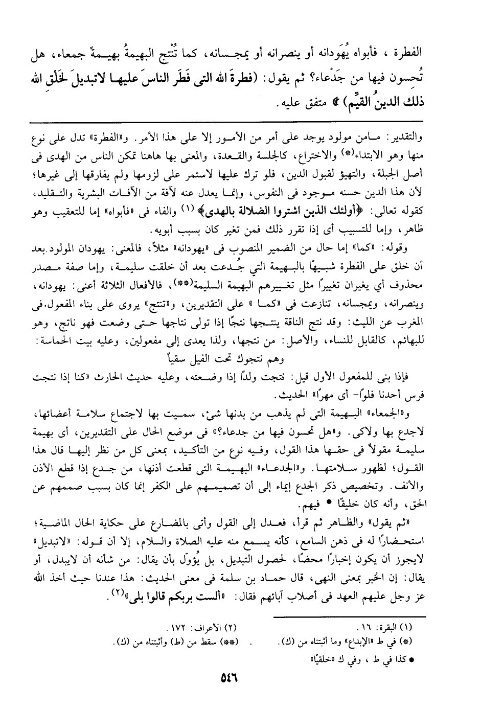 وقوله: ((كما)) إما حال من الضمير المنصوب في ((يهودانه)) مثلا، فالمعنى: يهودان المولود بعد أن خلق على الفطرة شبيها بالبهيمة التي جدعت بعد أن خلقت سليمة، وإما صفة مصدر محذوف أي يغيران تغييرا مثل تغييرهم البهيمة السليمة، فالأفعال الثلاثة أعني: يهودانه، وينصرانه، ويمجسانه، تنازعت في ((كما)) على التقديرين، و ((تنتج)) يروى على بناء المفعول في المغرب عن الليث: وقد نتج الناقة ينتجها نتجا إذا تولى نتاجها حتى وضعت فهو ناتج، وهو للبهائم، كالقابل للنساء، والأصل: من نتجها، ولذا يعدى إلى مفعولين، وعليه بيت الحماسة: