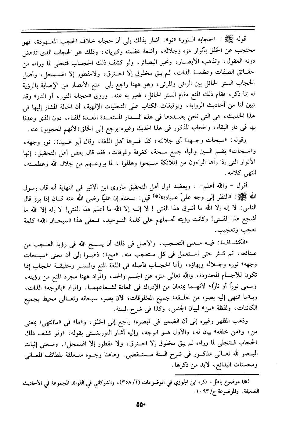 ((الكشاف)): فيه معنى التعجب، والأصل في ذلك أن يسبح الله في رؤية العجب من صنائعه، ثم كثر حتى استعمل في كل متعجب منه. ((مح)): ذهبوا إلى أن معنى ((سبحات وجهه)) نوره وجلاله وبهاؤه، وأما الحجاب فأصله في اللغة المنع والستر وحقيقة الحجاب إنما تكون للأجسام المحدودة، والله تعالى منزه عن الجسم والحد، والمراد ههنا مجرد المنع من رؤيته، وسمي نورا أو نارا؛ لأنهما يمنعان من الإدراك في العادة لشعاعهما. والمراد ((بالوجه)) الذات، وبـ ((ما انتهى إليه بصره من خلقه)) جميع المخلوقات؛ لأن بصره سبحانه وتعالى محيط بجميع الكائنات، ولفظه ((من)) لبيان الجنس، وكذا في شرح السنة.
