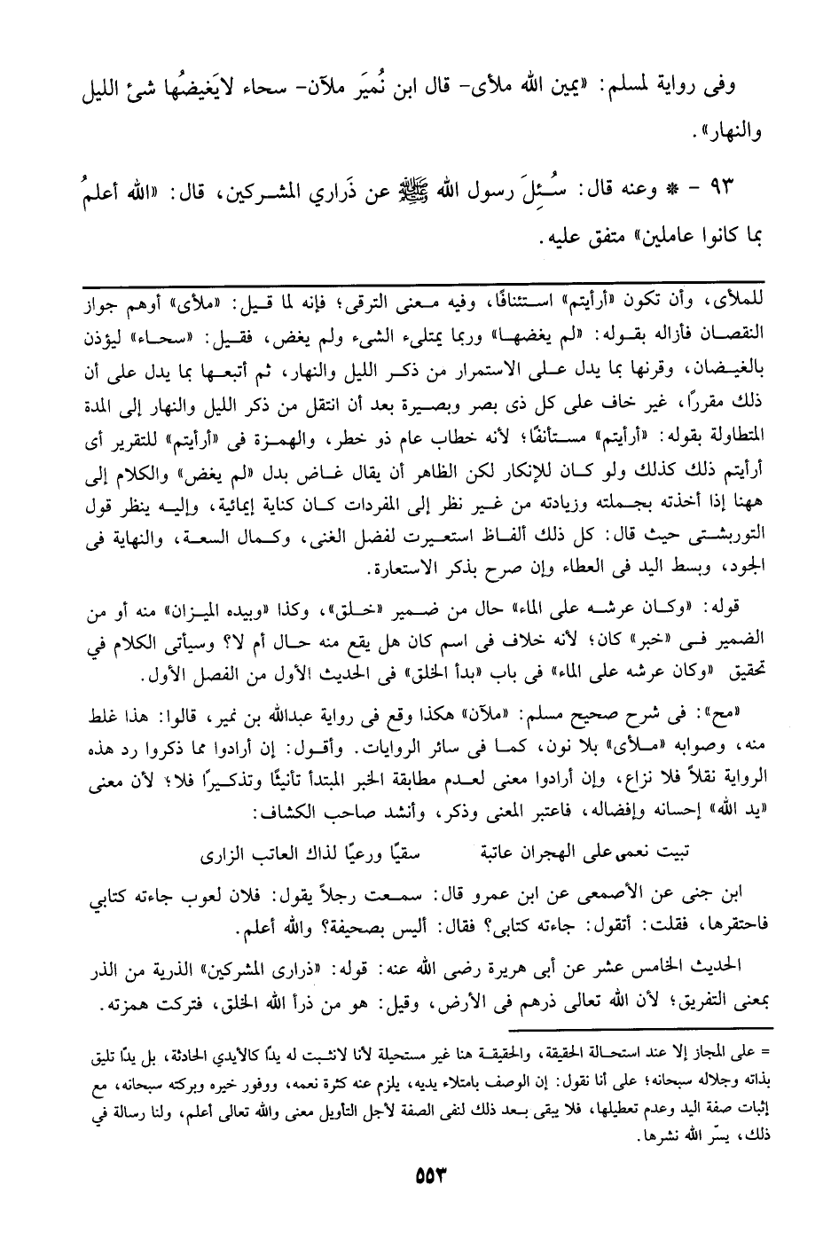 ((مح)): في شرح صحيح مسلم: ((ملآن)) هكذا وقع في رواية عبد الله بن نمير، قالوا: هذا غلط منه، وصوابه ((ملأى)) بلا نون، كما في سائر الروايات. وأقول: إن أرادوا مما ذكروا رد هذه الرواية نقلا فلا نزاع، وإن أرادوا معنى لعدم مطابقة الخبر المبتدأ تأنيثا وتذكيرا فلا؛ لأن معنى ((يد الله)) إحسانه وإفضاله، فاعتبر المعنى وذكر، وأنشد صاحب الكشاف: