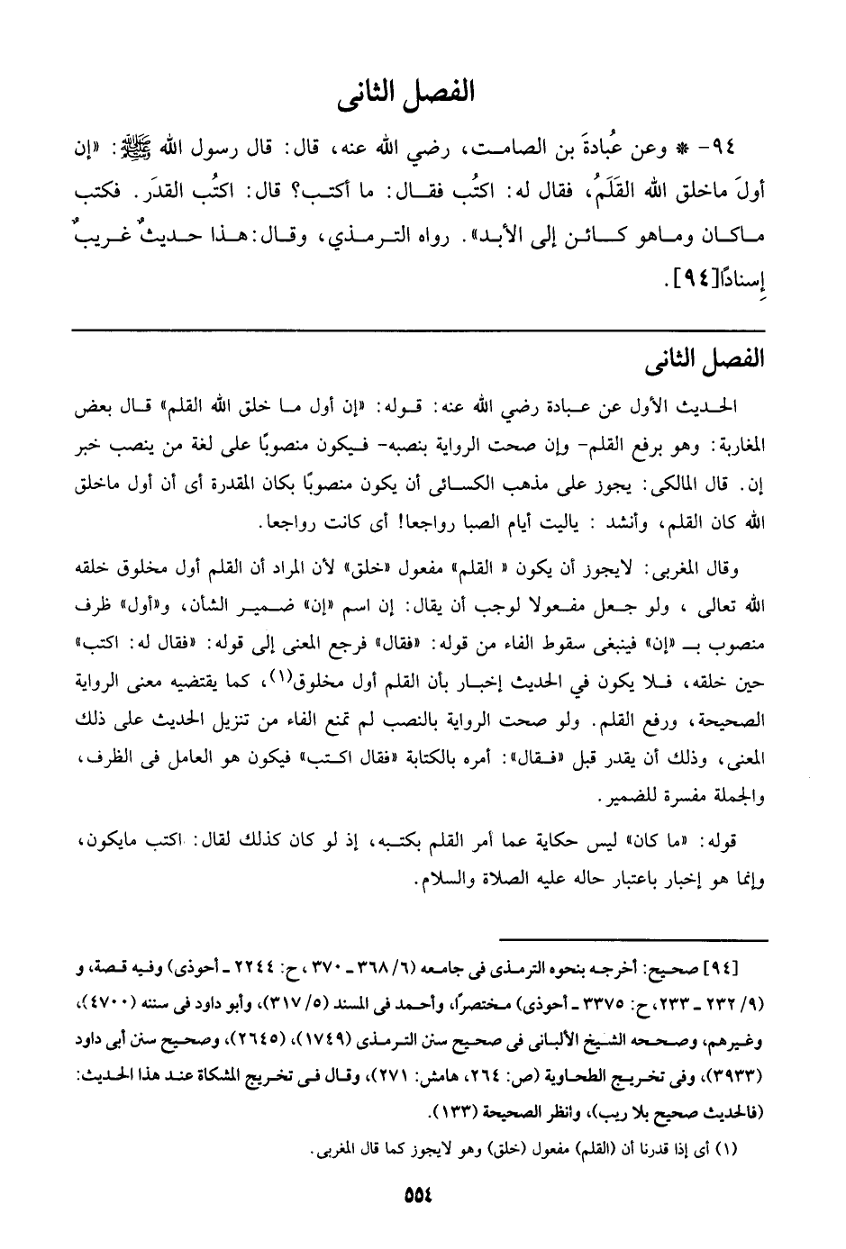 الحديث الأول عن عبادة رضي الله عنه: قوله: ((إن أول ما خلق الله القلم)) قال بعض المغاربة: وهو برفع القلم – وإن صحت الرواية بنصبه – فيكون منصوبا على لغة من ينصب خبر إن. قال المالكي: يجوز على مذهب الكسائي أن يكون منصوبا بكان المقدرة أي أن أول ما خلق الله كان القلم، وأنشد: يا ليت أيام الصبا رواجعا! أي كانت رواجعا.