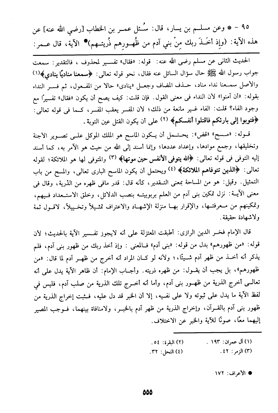 95 - وعن مسلم بن يسار، قال: سئل عمر بن الخطاب [رضي الله عنه] عن هذه الآية: {وإذْ أَخَذَ رَبُّكَ مِن بَنِي آدَمَ مِن ظُهُورِهِمْ ذُرِّيَّتَهُمْ} الآية، قال عمر: