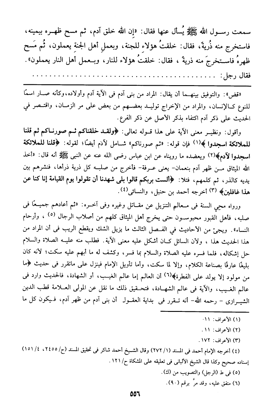 ورواه محي السنة في معالم التنزيل عن مقاتل وغيره وفي آخره: ((ثم أعادهم جميعا في صلبه، فأهل القبور محبوسون حتى يخرج أهل الميثاق كلهم من أصلاب الرجال، وأرحام النساء)). ويجيء من الأحاديث في الفصل الثالث ما يزيل الشك ويقطع الريب في أن المراد من هذا الحديث هذا، ولأن السائل كان أشكل عليه معنى الآية. فطلب منه عليه الصلاة والسلام حل إشكاله، فلما فسره عليه الصلاة والسلام بما فسر، وكشف له ما أبهم عليه سكت؛ لأنه كان بليغا عارفا بصناعة الكلام، وإلا لما سكت، وأما تأويل الإمام فينزل على ما تقرر في حديث (ما من مولود إلا يولد على الفطرة) أن العالم إما عالم الغيب، أو الشهادة، فالحديث وارد في عالم الغيب، والآية في عالم الشهادة، فتحقيق ذلك ما نقل عن المولى العلامة قطب الدين الشيرازي – رحمه الله – أنه تقرر في بداية العقول أن بني آدم من ظهر آدم، فيكون كل ما