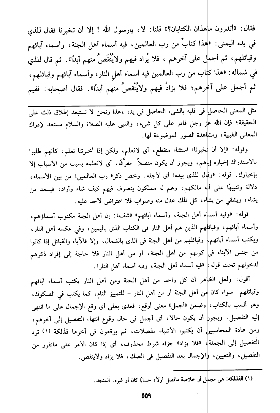 أقول: ولعل الظاهر أن كل واحد من أهل الجنة ومن أهل النار يكتب أسماء آبائهم وقبائلهم – سوار كان من أهل الجنة أو من أهل النار- للتمييز التام، كما يكتب في الصكوك، وهو أنسب بالكتاب، وضمن ((أجمل)) معنى أوقع، فعدى بعلى أي وقع الإجمال على ما انتهى إليه التفصيل. ويجوز أن يكون حالا، أي أجمل في حال وقوع انتهاء التفصيل إلى آخرهم، ومن عادة المحاسبين أن يكتبوا الأشياء مفصلات، ثم يوقعون في آخرها فذلكة ترد التفصيل إلى الجملة، ((فلا يزاد)) جزءا شرط محذوف، أي إذا كان الأمر على ما تقرر من التفصيل، والتعيين، والإجمال بعد التفصيل في الصك، فلا يزاد ولا ينقص.