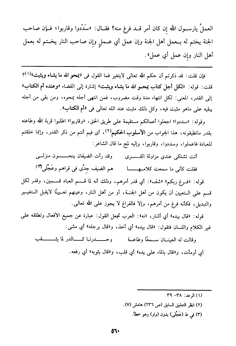 وقوله: ((سددوا)) اجعلوا أعمالكم مستقيمة على طريق الحق, ((وقاربوا)) اطلبوا قربة الله وطاعته بقدر متطيقونه, وهذا الجواب من الأسلوب الحكيم, أي فيم أنتم من ذكر القدر, وإنما خلقتم للعبادة فاعملوا, وسددوا, وقاربوا, وإليه لمح ما قال الشاعر: