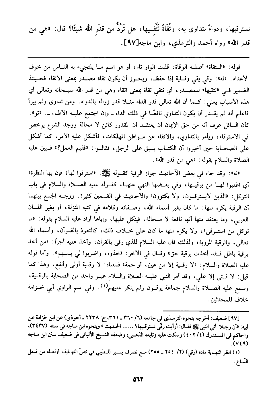 نسترقيها, ودواء نتداوى به, وتقاة نتقيها, هل ترد من قدر الله شيئا؟ قال: ((هي من قدر الله)) رواه أحمد والترمذي, وابن ماجه [97].