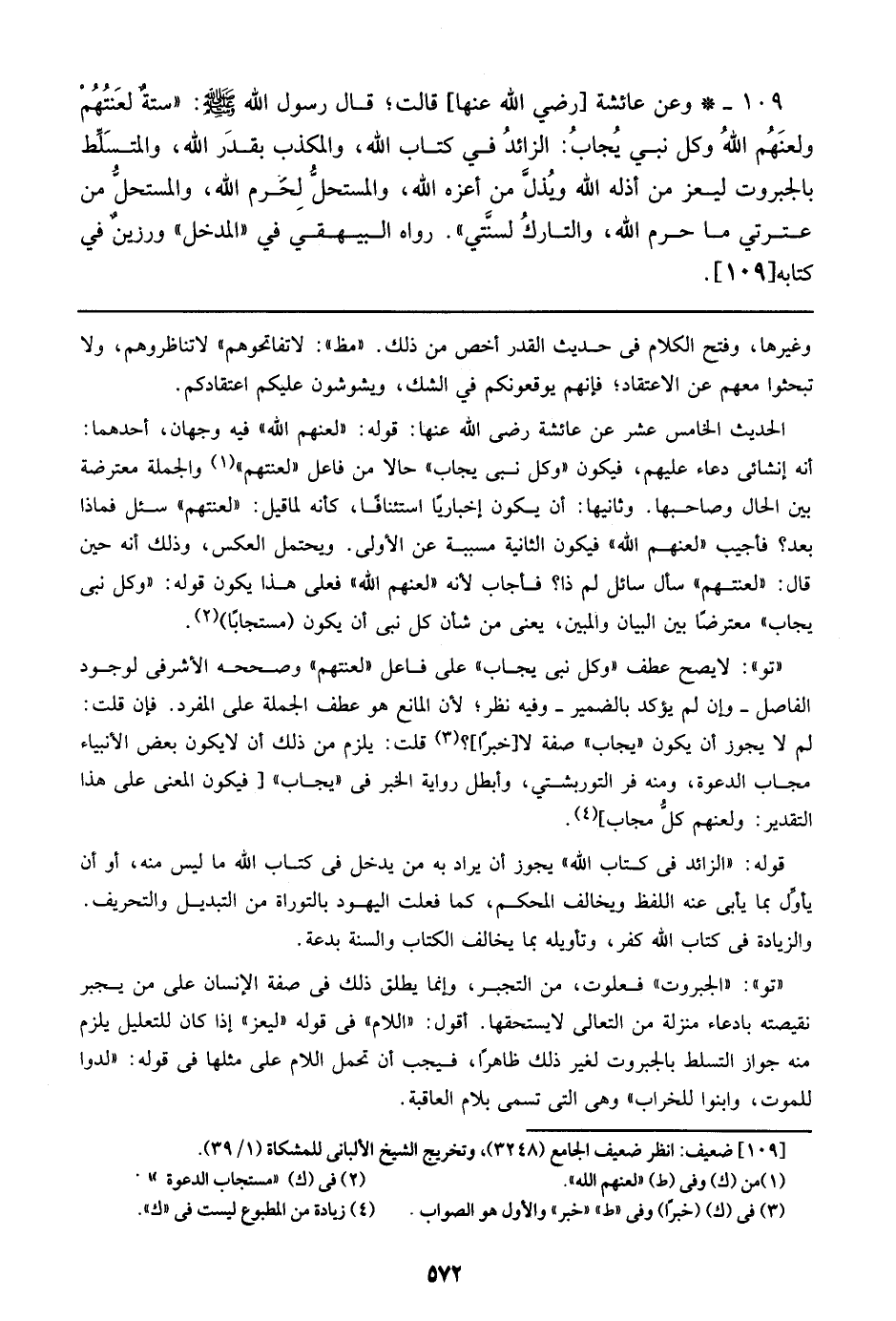 109 - وعن عائشة [رضي الله عنها] قالت؛ قال رسول الله صلى الله عليه وسلم: ((ستة لعنتهم ولعنهم الله وكل نبي يجاب: الزائد في كتاب الله، والمكذب بقدر الله، والمتسلط بالجبروت ليعز من أذله الله ويذل من أعزه الله، والمستحل لحرم الله، والمستحل من عترتي ما حرم الله، والتارك لسنتي)). رواه البيهقي في ((المدخل)) ورزين في كتابه [109].