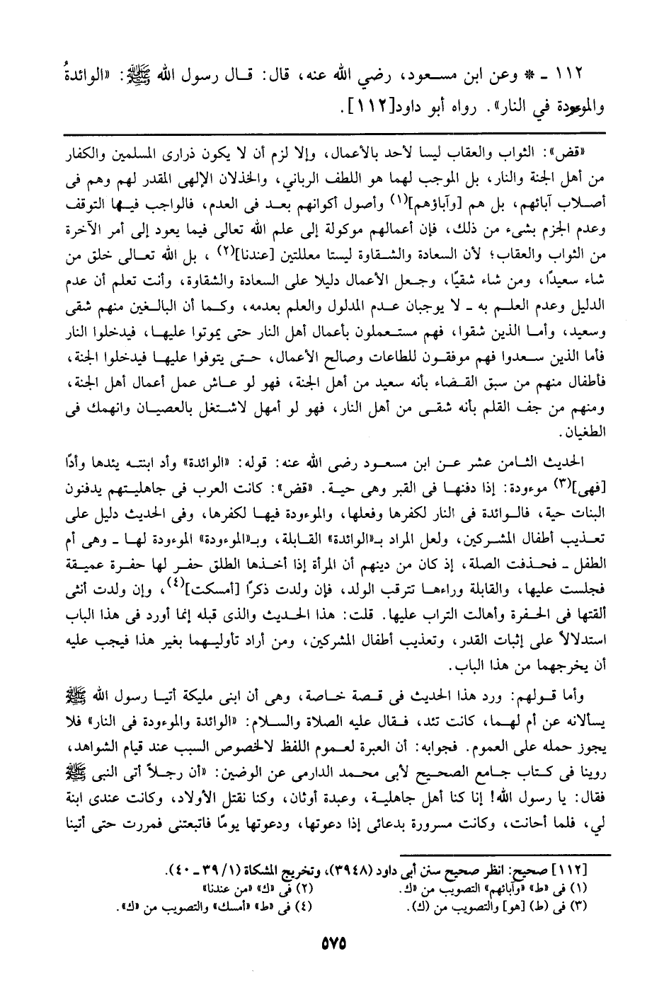 112 - وعن ابن مسعود، رضي الله عنه، قال: قال رسول الله صلى الله عليه وسلم: ((الوائدة والموءودة في النار)). رواه أبو داود [112]