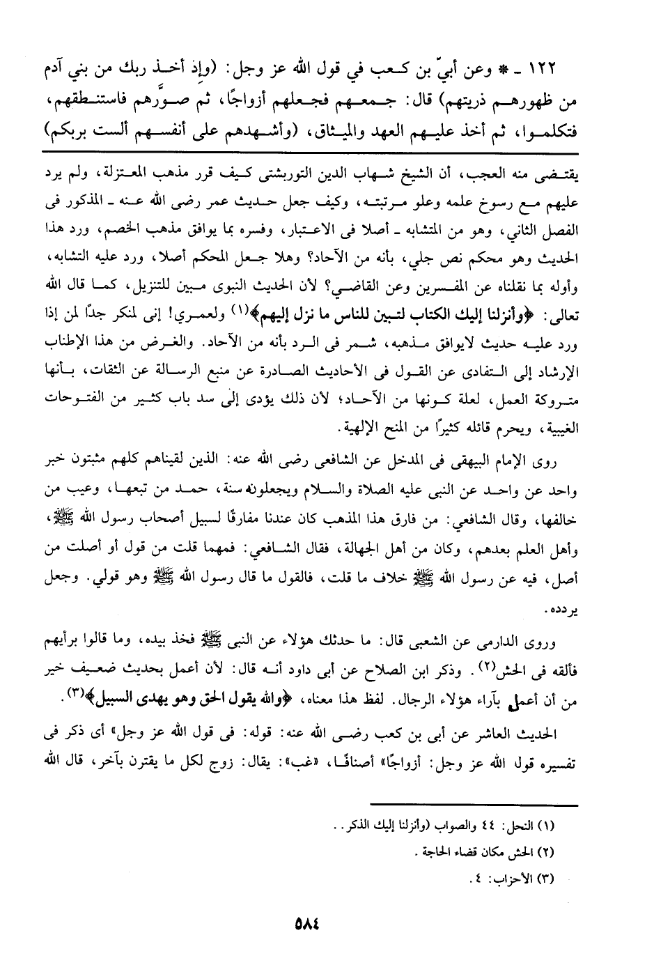 122 - وعن أبي بن كعب في قول الله عز وجل: (وإذ أخذ ربك من بني آدم من ظهورهم ذريتهم) قال: جمعهم فجعلهم أزواجاً، ثم صورهم فاستنطقهم، فتكلموا، ثم أخذ عليهم العهد والميثاق، (وأشهدهم على أنفسهم ألست بربكم)