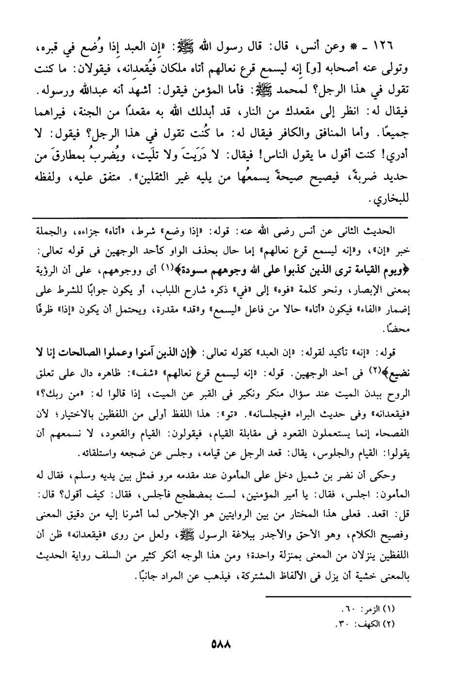 126 - وعن أنس، قال: قال رسول الله صلى الله عليه وسلم: ((إن العبد إذا وضع في قبره، وتولى عنه أصحابه [و] إنه ليسمع قرع نعالهم أتاه ملكان فيقعدانه، فيقولون: ما كنت تقول في هذا الرجل؟ لمحمد صلى الله عليه وسلم: فأما المؤمن فيقول: أشهد أنه عبد الله ورسوله. فيقال له: انظر إلى مقعدك من النار، قد أبدلك الله به مقعداً من الجنة، فيراهما جميعاً. وأما المنافق والكافر فيقال له: ما كنت تقول في هذا الرجل؟ فيقول: لا أدري! كنت أقول ما يقول الناس! فيقال: لا دريت ولا تليت، ويضرب بمطارق من حديد ضربة، فيصيح صيحة يسمعها من يليه غير الثقلين)). متفق عليه، ولفظه للبخاري.