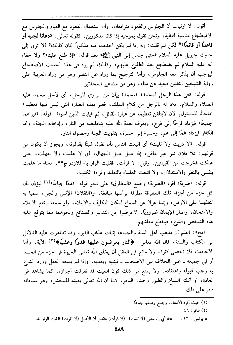 أقول: لا ارتياب أن الجلوس والقعود مترادفان، وأن استعمال القعود مع القيام والجلوس مع الاضطجاع مناسبة لفظية، ونحن نقول بموجبه إذا كانا مذكورين، كقوله تعالى: ((دَعَانَا لِجَنْبِهِ أَوْ قَاعِدًا أَوْ قَائِمًا)) لكن لم قلت: إنه إذا لم يكن أحدهما منه مذكوراً كان كذلك؟ ألا ترى إلى حديث جبريل عليه السلام ((حتى جلس إلى النبي صلى الله عليه وسلم)) بعد قوله: ((إذا طلع علينا؟)) ولا خفاء أنه عليه السلام لم يضطجع بعد الطلوع عليهم، وكذلك لم يرد في هذا الحديث الاضطجاع ليوجب أن يذكر معه الجلوس، وأما الترجيح بما رواه عن النضر وهو من رواة العربية على رواية الشيخين الثقتين فبعيد عن مثله، وهو من مشاهير المحدثين.