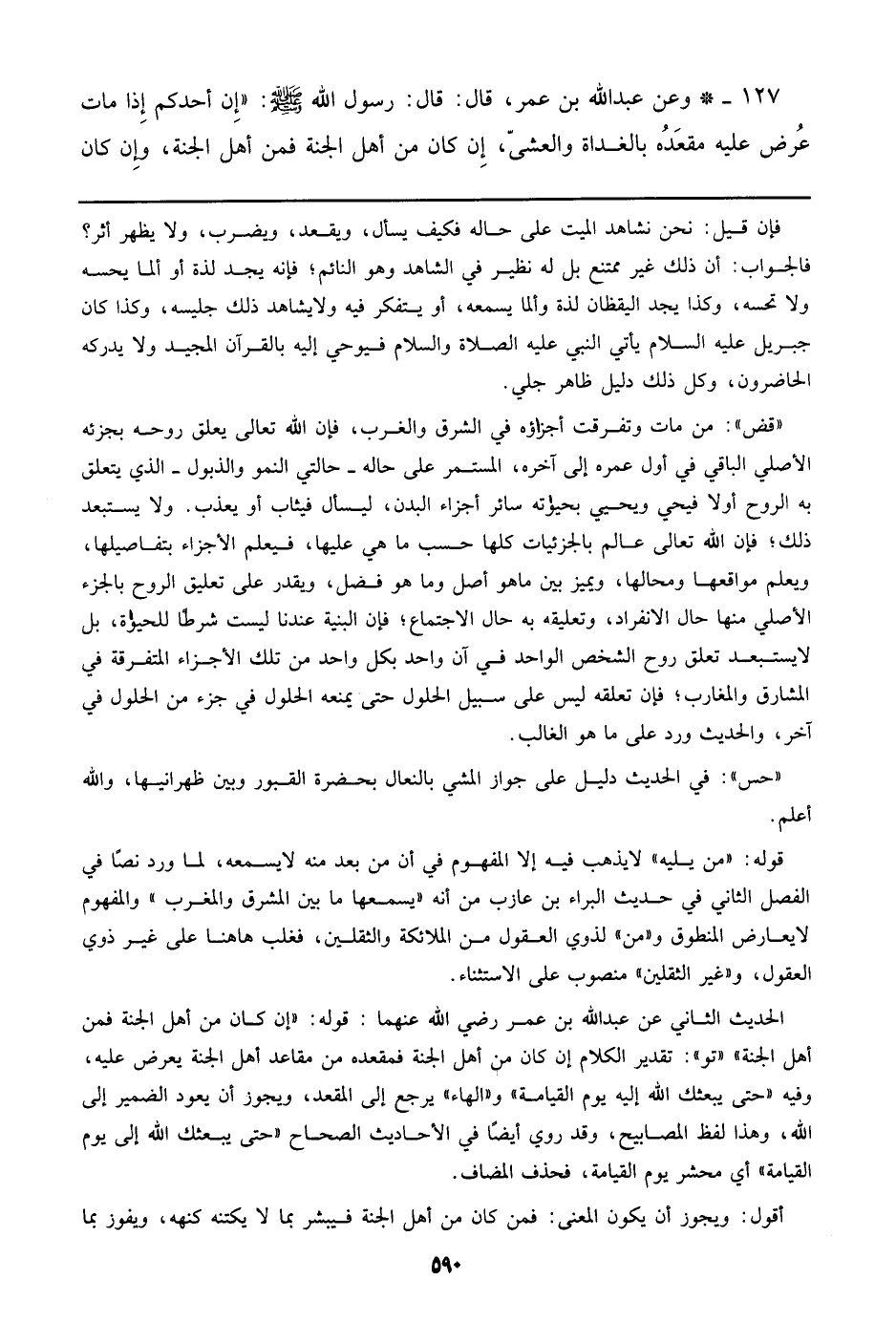 127 - وعن عبد الله بن عمر، قال: قال: رسول الله صلى الله عليه وسلم: ((إن أحدكم إذا مات عرض عليه مقعده بالغداة والعشى، إن كان من أهل الجنة فمن أهل الجنة، وإن كان