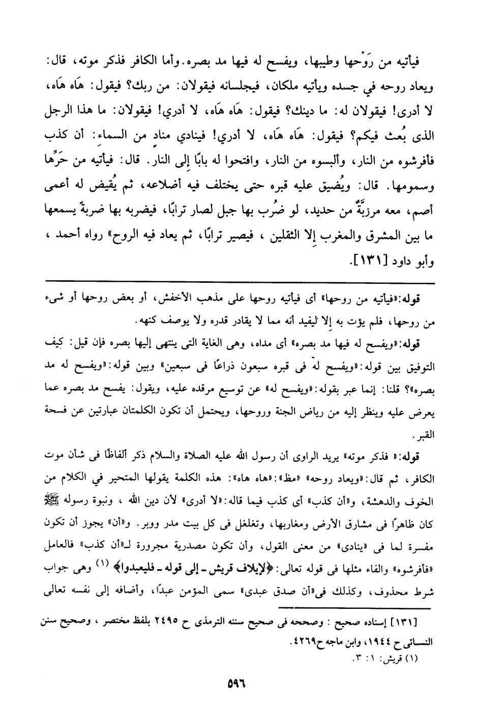 قوله: ((فذكر موته)) يريد الراوي أن رسول الله عليه الصلاة والسلام ذكر ألفاظاً في شأن موت الكافر، ثم قال: ((ويعاد روحه)) ((مظ)): ((هاه هاه)): هذه الكلمة يقولها المتحير في الكلام م الخوف والدهشة، و ((أن كذب)) أي كذب فيما قاله: ((لا أدري)) لأن دين الله، ونبوة رسوله صلى الله عليه وسلم كان ظاهراً في مشارق الأرض ومغاربها، وتغلغل في كل بيت مدر ووبر. و ((أن)) يجوز أن تكون مفسرة لما في ((ينادي)) من معنى القول، وأن تكون مصدرية مجرورة لـ ((أن كذب)) فالعامل ((فأفرشوه)) والفاء في قوله تعالى: {لإيلافِ قُرَيْشٍ – إلى قوله - فَلْيَعْبُدُوا} وهي جواب شرط محذوف، وكذلك في ((أن صدق عبدي)) سمى المؤمن عبداً، وأضافه إلى نفسه تعالى