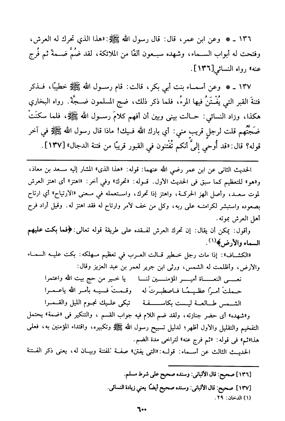 136 - وعن ابن عمر، قال: قال رسول الله صلى الله عليه وسلم: ((هذا الذي تحرك له العرش، وفتحت له أبواب السماء، وشهده سبعون ألفاً من الملائكة، لقد ضم ضمة ثم فرج عنه)) رواه النسائي [136].
