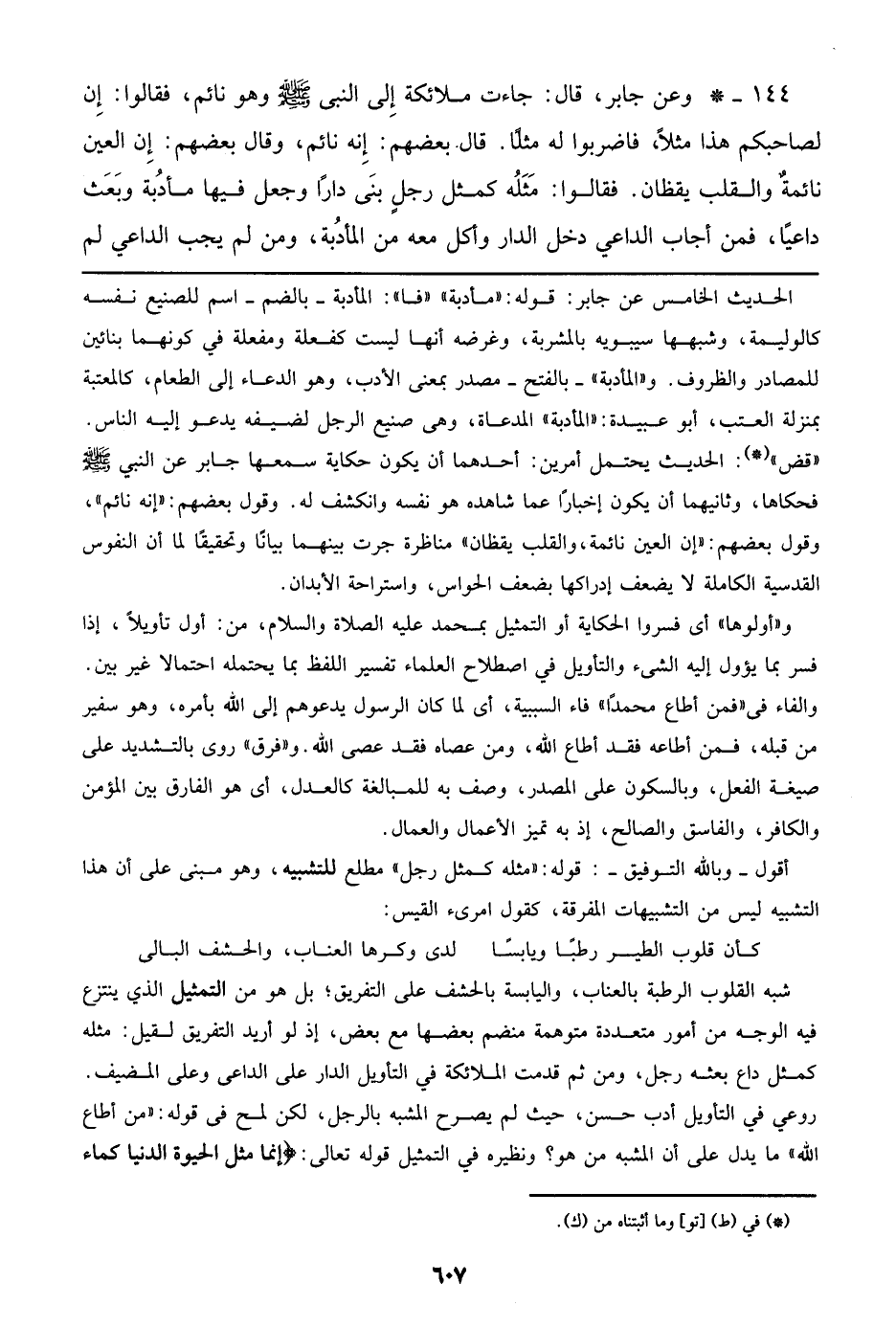 144 - وعن جابر، قال: جاءت ملائكة إلى النبي صلى الله عليه وسلم وهو نائم، فقالوا: إن لصاحبكم هذا مثلاً؛ فاضربوا له مثلاً. قال بعضهم: إنه نائم، وقال بعضهم: إن العين نائمة والقلب يقظان. فقالوا: مثله كمثل رجل بنى داراً وجعل فيها مأدبة وبعث داعياً، فمن أجاب الداعي دخل الدار وأكل معه من المأدبة، ومن لم يجب الداعي لم