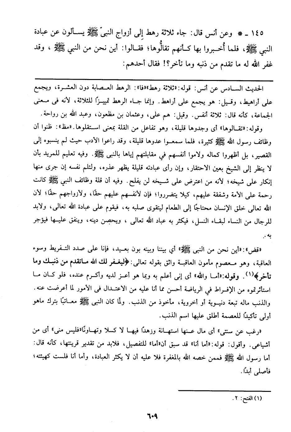 145 - وعن أنس قال: جاء ثلاثة رهط إلى أزواج النبي صلى الله عليه وسلم يسألون عن عبادة النبي صلى الله عليه وسلم، فلما أخبروا بها كأنهم تقالوها؛ فقالوا: أين نحن من النبي صلى الله عليه وسلم، وقد غفر الله له ما تقدم من ذنبه وما تأخر؟! فقال أحدهم: