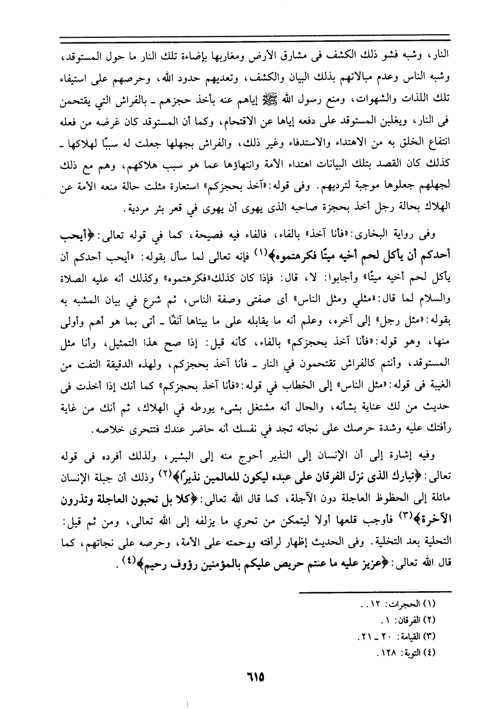 النار، وشبه فشو ذلك الكشف في مشارق الأرض ومغاربها بإضاءة تلك النار ما حول المستوقد، وشبه الناس وعدم مبالاتهم بذلك البيان والكشف، وتعديهم حدود الله، وحرصهم على استيفاء تلك اللذات والشهوات، ومنع رسول الله صلى الله عليه وسلم إياهم عنه بأخذ حجزهم – بالفراش التي يقتحمن في النار، ويغلبن المستوقد على دفعه إياها عن الاقتحام، وكما أن المستوقد كان غرضه من فعله انتفاع الخلق به من الاهتداء والاستدفاء وغير ذلك، والفراش بجهلها جعلت له سبباً لهلاكها – كذلك كان القصد بتلك البيانات اهتداء الأمة وانتهاؤها عما هو سبب هلاكهم، وهم مع ذلك لجهلهم جعلوهم موجبة لترديهم. وفي قوله: ((آخذ بحجزكم)) استعارة مثلت حالة منعه الأمة عن الهلاك بحالة رجل أخذ بحجرة صاحبه الذي يهوى أن يهوى في قعر بئر مردية.