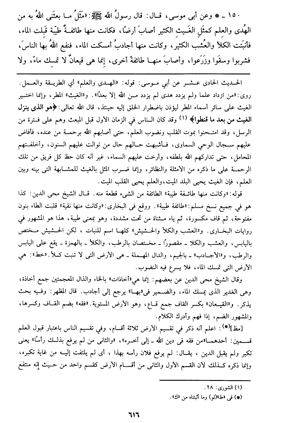 150 - وعن أبي موسى، قال: قال رسول الله صلى الله عليه وسلم: ((مثل ما بعثني الله به من الهدى والعلم كمثل الغيث الكثير أصاب أرضاً، فكانت منها طائفة طيبة قبلت الماء، فأنبتت الكلأ والعشب الكثير، وكانت منها أجادب أمسكت الماء، فنفع الله بها الناس، فشربوا وسقوا وزرعوا، وأصاب منها طائفة أخرى، إنما هي قيعان لا تمسك ماء، ولا