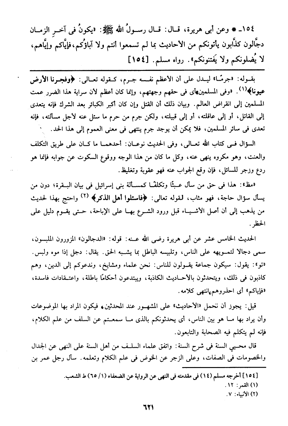 154 - وعن أبي هريرة، قال: قال رسول الله صلى الله عليه وسلم: ((يكون في آخر الزمان دجالون كذابون يأتونكم من الأحاديث بما لم تسمعوا أنتم ولا آباؤكم، فإياكم وإياهم، لا يضلونكم ولا يفتنونكم)). رواه مسلم. [154]