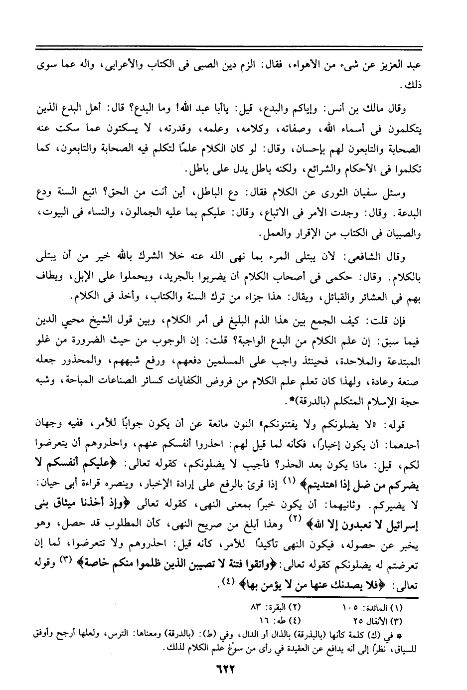 وقال مالك بن أنس: وإياكم والبدع، قيل: يا أبا عبد الله! وما البدع؟ قال: أهل البدع الذين يتكلمون في أسماء الله، وصفاته، وكلامه، وعلمه، وقدرته، لا يسكتون عما سكت عنه الصحابة والتابعون لهم بإحسان، وقال: لو كان الكلام علماً لتكلم فيه الصحابة والتابعون، كما تكلموا في الأحكام والشرائع، ولكنه باطل يدل على باطل.