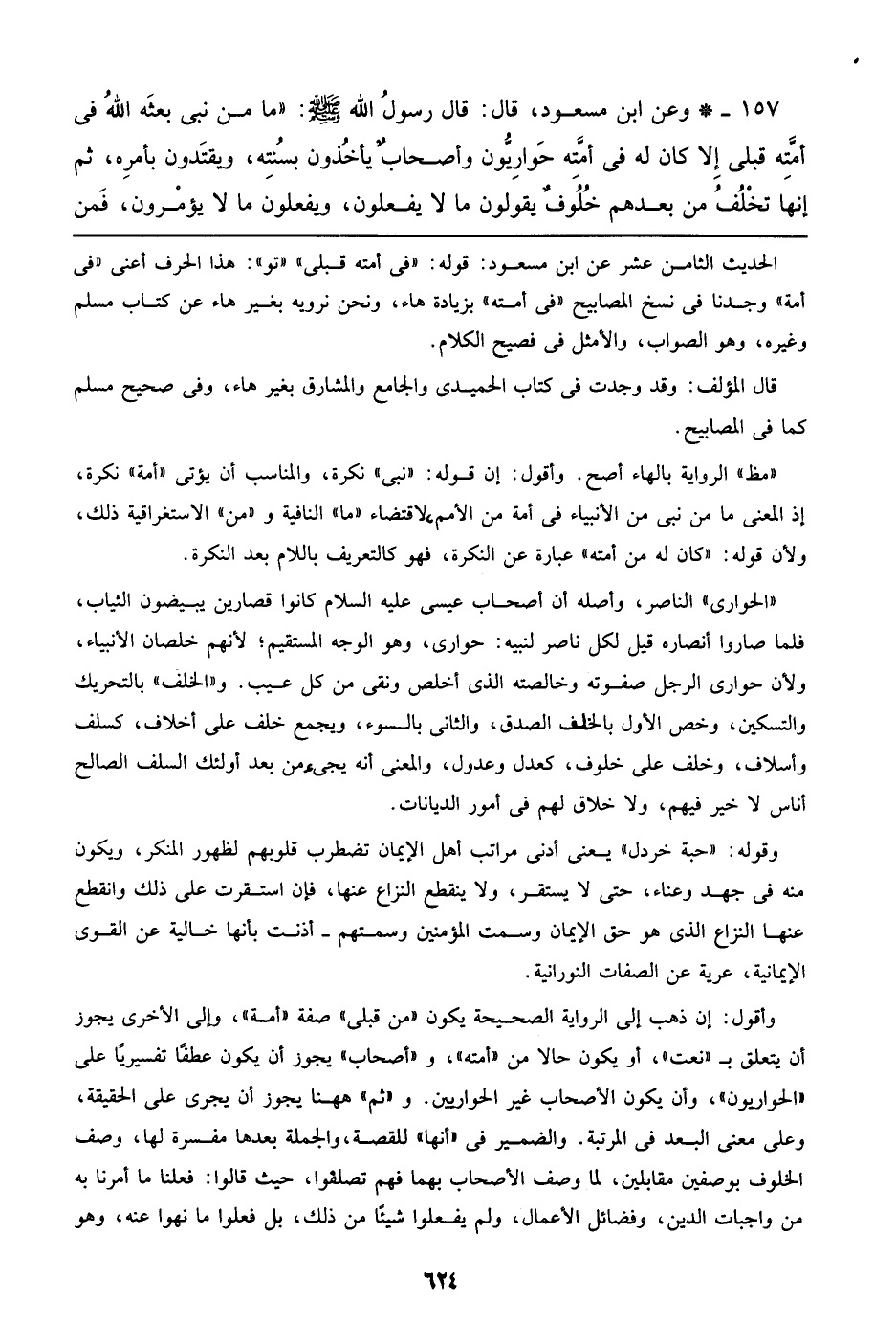 ((مظ)) الرواية بالهاء أصح. وأقول: إن قوله: ((نبي)) نكرة، والمناسب أن يؤتى ((أمة)) نكرة، إذ المعنى ما من نبي من الأنبياء في أمة من الأمم، لاقتضاء ((ما)) النافية و ((من)) الاستغراقية ذلك، ولأن قوله: ((كان له من أمته)) عبارة عن النكرة، فهو كالتعريف باللام بعد النكرة.