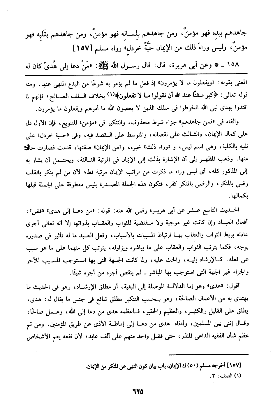 أقول: ((هدى)) وهو إما الدلالة الموصلة إلى البغية، أو مطلق الإرشاد، وهو في الحديث ما يهتدي به من الأعمال الصالحة، وهو بحسب التنكير مطلق شائع في جنس ما يقال له: هدى، يطلق على القليل والكثير، والعظيم والحقير، فأعظمه هدى من دعا إلى الله، وعمل صالحا، وقال إنني من المسلمين، وأدناه هدى من دعا إلى إماطة الأذى عن طريق المؤمنين، ومن ثم عظم شأن الفقيه الداعي المنذر، حتى فضل واحد منهم على ألف عابد؛ لأن نفعه يعم الأشخاص