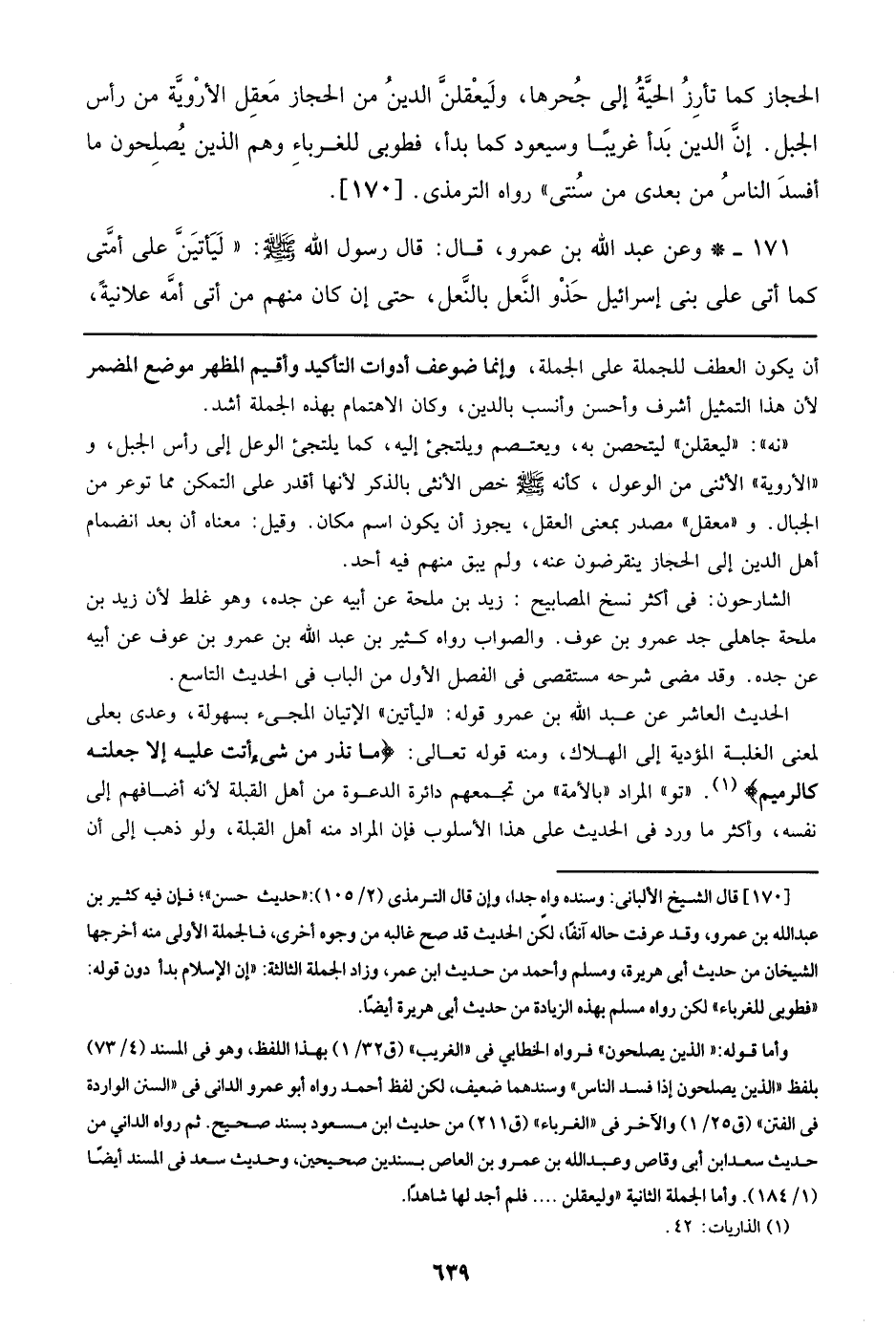 الحجاز كما تأرز الحية إلى جحرها, وليعقلن الدين من الحجاز معقل الأروية من رأس الجبل. إن الدين بدأ غريبا وسيعود كما بدأ, فطوبى للغرباء وهم الذين يصلحون ما أفسد الناس من بعدي من سنتي)) رواه الترمذي. [170].