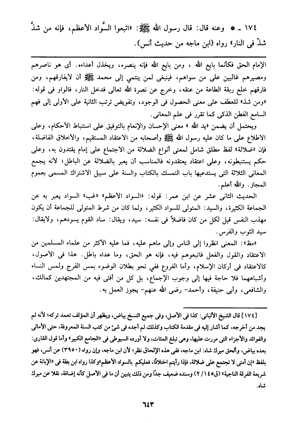174 - وعنه قال: قال رسول الله صلى الله عليه وسلم: ((اتبعوا السواد الأعظم, فإنه من شذ شذ في النار)) رواه ((ابن ماجه من حديث أنس)).