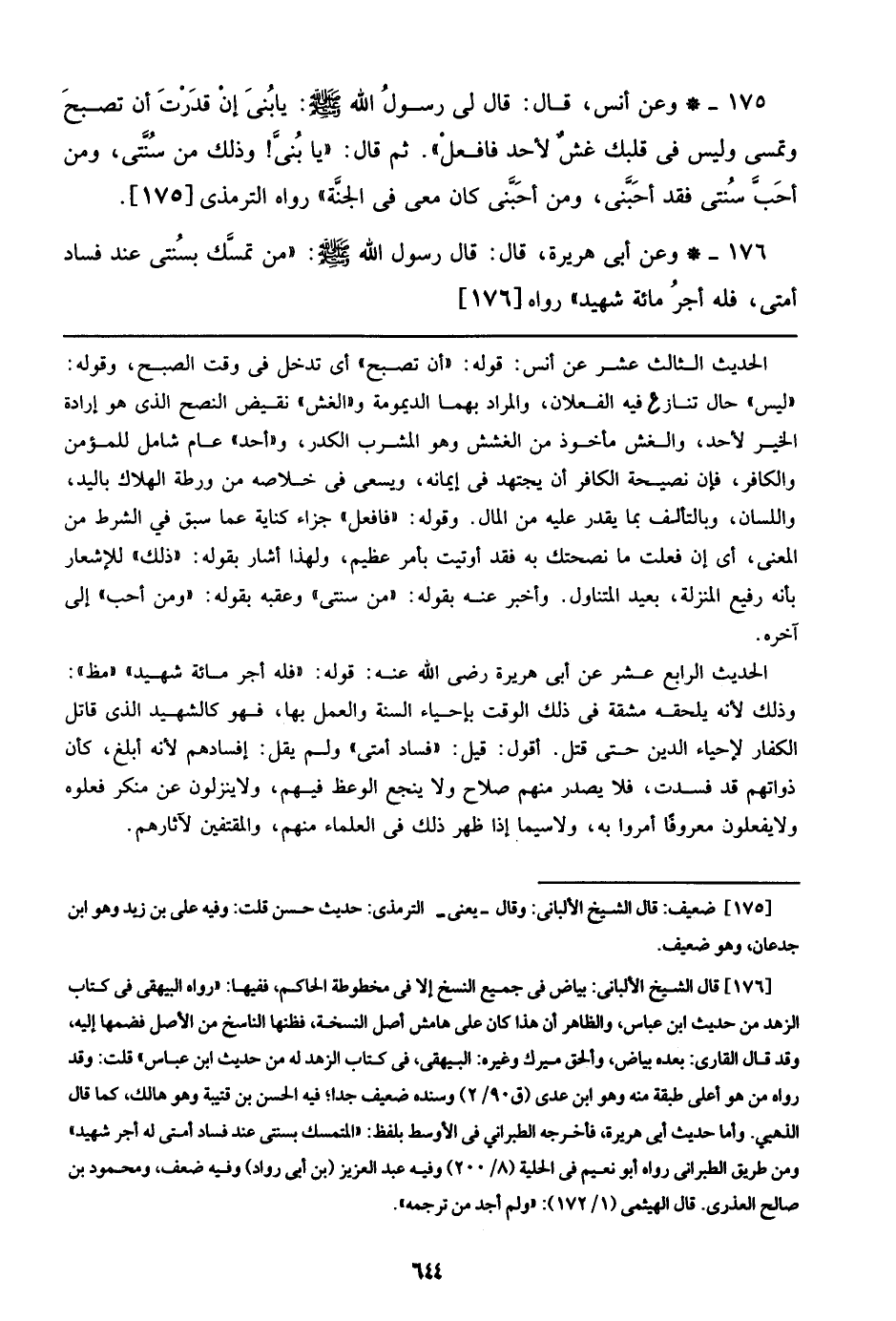 176 - وعن أبي هريرة, قال: قال رسول الله صلى الله عليه وسلم: ((من تمسك بسنتي عند فساد أمتي, فله أجر مائة شهيد)) رواه [176].