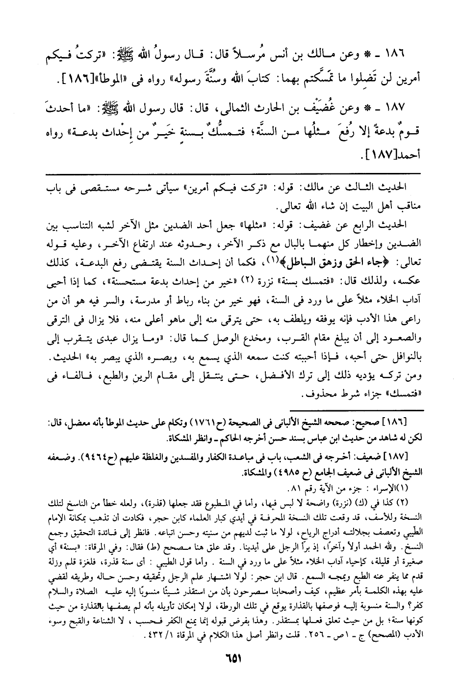 186 - وعن مالك بن أنس مرسلا قال: قال رسول الله صلى الله عليه وسلم: ((تركت فيكم أمرين لن تضلوا ما تمسكتم بهما: كتاب الله وسنة رسوله)) رواه في ((الموطأ)) [186].